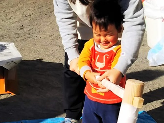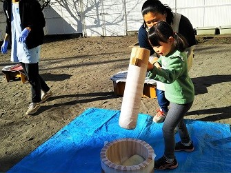 株式会社日本保育サービスが運営するアスク下小田中保育園(神奈川県川崎市)では、2020年12月18日(金)に保育園行事の一環として、「おもちつき大会」を実施しました。当日は園庭に杵と臼を用意し、職員が手伝いながら、園児たちが順番に餅つきを体験しました。初めて餅つきを体験した園児もおり、想像していたよりも重い杵や、粘り気のある餅に驚いていました。保育室に戻った後も餅つきの印象が強く残ったのか、園児たちは「お餅は何からできるの?」「何でお水をつけるの?」と興味深そうに職員に質問していました。