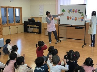 また、同社が運営するアスク利府保育園(宮城県宮城郡)では、2021年1月5日(火)に、「新春お祝い会」を開催しました。元気いっぱいの「あけましておめでとう」の挨拶で始まったお祝い会では、職員が手作りのマグネットシアターで「十二支のおはなし」を紹介しました。園児たちは、知っている動物が出てくると、「今年は『うし』だよね」「僕は『ねずみ』年!」と盛り上がっていました。