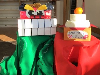ホールで行われた餅つきでは、4、5歳児が順番に1人ずつ餅つきを体験しました。自分の番が近づくと緊張している園児もいましたが、つきたての餅を目の前に「お餅の良いにおいがする!」と喜ぶ様子が見られました。降園時には、職員が手作りした獅子舞と鏡餅の飾り物を見ながら、迎えに来た保護者と園児が楽しそうに会話する様子も見られ、園全体でお正月の風物詩を楽しみました。