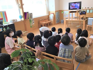 国際オンラインプログラムでは、チャット画面にお互いの発表内容が日本語と英語で表示され、保育士が発表内容を説明することで、相手国のこどもたちとリアルタイムでスムーズな意思疎通ができる仕組みとなっています。