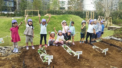 東京都千代田区にあるアスク二番町保育園では、園児たちが、近隣にある日本テレビ旧社屋跡地にできた広場「番町の森」内の「番町の畑」で9月21日(火)に開催された第1回菜園体験に参加しました。