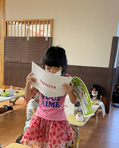 出張教室ではトヨタの社員が講師となり、こどもたちは、身近なトンボを題材に、「推理クイズ」や「3コママンガ」などを通じて遊びながら環境について学びました。