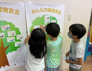 出張教室の最後には、当日学んだことを踏まえて、トンボが元気に暮らせる環境を守るために自分でできる「環境宣言」をこどもたち自身で考えてカードに書き込み、壁のポスター「みんなの環境宣言」に貼り付けました。ポスターには「川を汚さない」「プラスチックをリサイクルする」「自然を大切にする」「地球温暖化を防ぐ」など、こどもたちの宣言が並びました。