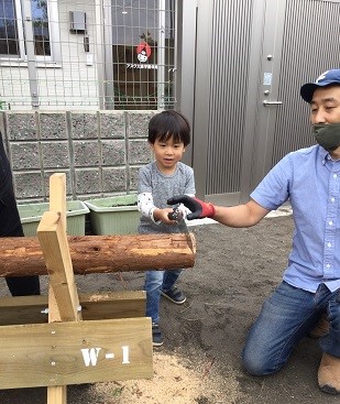 また、幼児クラスを対象に行った丸太切り体験では、のこぎりを自らの手で持ち、直径10センチほどの丸太切りにチャレンジしました。こどもたちは、のこぎりの安全な使い方と切り方の注意を真剣に聞き、職員らのサポートを受けながら、緊張した面持ちで果敢に挑戦していました。
