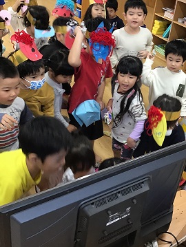 「何で鬼になったの?」との園長からの質問に、「人間の悪い心が入ったから鬼になった。だから、みんなで豆を投げて、鬼の中の悪い心を追い払ってほしい。」と鬼が答えると、こどもたちは「鬼は外!」と元気な掛け声とともに、新聞紙で作った豆を画面に向かって投げました。すると、鬼の角がポロリと外れ、優しい表情に。「みんなの中に悪い心が生まれたら、『鬼は外』と言うんだよ。」との優しくなった鬼からの言葉に、こどもたちは真剣にうなずいていました。