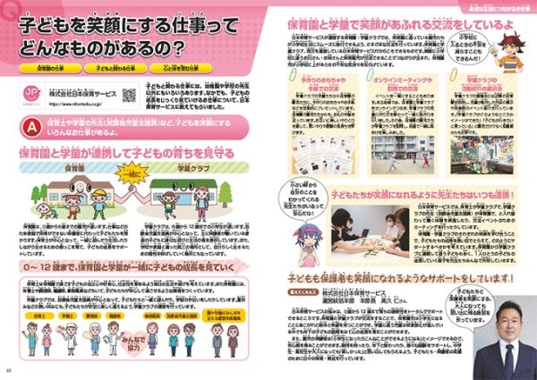 日本保育サービスの掲載は、昨年に引き続き 4 回目です。今年は「こどもを笑顔にする仕事ってどんなものがあるの?」というテーマで、保育園と学童クラブで働く先生たちの仕事を紹介しています。