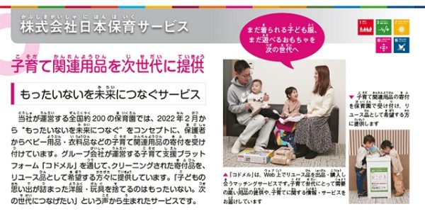 日本保育サービスでは、“もったいないを未来につなぐ”をコンセプトに、全国で運営する保育園にて保護者からベビー用品・衣料品などの子育て関連用品の寄付を受け付けるBOXを設置しています。寄付いただいた品々はクリーニングし、グループ会社の日本保育総合研究所が運営する子育て支援プラットフォーム「コドメル」を通じて、WEB上でリユース品として希望者に提供しています。