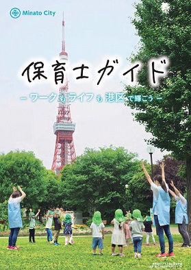 アスク芝公園保育園の保育士とこどもたちの写真が使用されている「保育士ガイド -ワークもライフも港区で輝こう-」の表紙