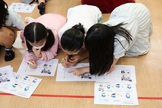 次は、「誤植みつけゲーム」にチャレンジし、編集の仕事の一つである校正を体験しました。キミノベルのラインナップの「マリ×トラ事件ファイル」の本文に誤植を5つ仕込んだ、今回のイベントのために特別に用意された原稿を手渡されたこどもたちは、5分間で誤植を見つけられるか挑戦しました。原稿を真剣に見つめながら、こどもたちは皆で協力して、見事、全問正解することができました。