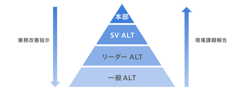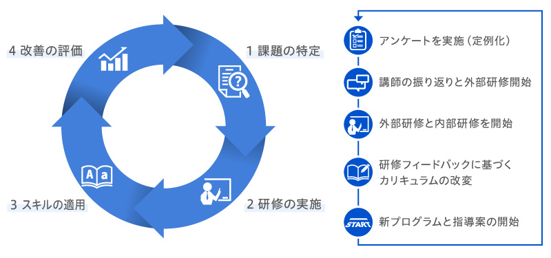実施するプログラムやALTの評価については、アンケートにより課題点を抽出し、改善を図る(進化する)というPDCAが常に回り続ける仕組みです。プログラムだけでなく、ALTの質向上も図っています。