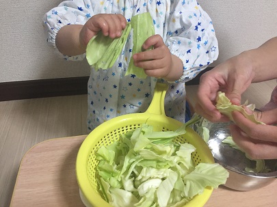 【レシピの一例「1歳児向け:野菜をちぎるだけで簡単!野菜ソテー」】