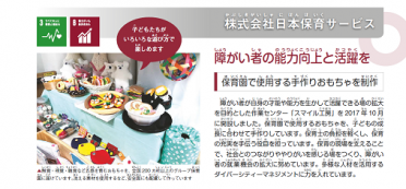 また、SDGsの取組みとして、日本保育サービスの「スマイル工房」の取組みも紹介しています。「スマイル工房」は、日本保育サービスが2017年10月に『障害者が自身の才能や能力を生かして活躍できる場の拡大』を目的として開設した作業センターです。スマイル工房では、こどもの成長に合わせた手作りのおもちゃを制作しており、全国200ヶ所以上の当社グループ運営施設で日々の保育に役立てられています。保育士の負担軽減など、保育の現場を支えることで、工房で働く従業員が社会とのつながりややりがいを感じる場となっています。