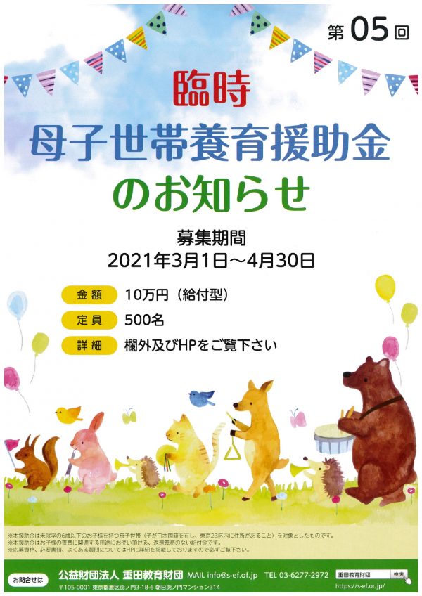 公益財団法人 重田教育財団より、母子世帯養育援助金の臨時募集に関するご案内をいただきました。この母子世帯養育援助金は、相対的貧困層の減少により経済格差解消を図るべく、相対的貧困層が多いと考えられる東京23区の6歳以下の未就学児を育てる母子世帯に対して「食育」「保育」「文教」「その他養育に関するもの」を使途とした返還義務のない養育援助金を給付するものです。