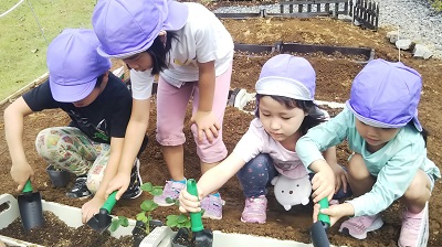 今回「番町の畑」で行われた菜園体験に参加したのはアスク二番町保育園の5歳児クラスのこどもたちです。こどもたちは、数日前からこのイベントを楽しみにしていていました。イベント当日は、畑の土に丁寧に穴をあけて二十日大根、人参、カリフラワー、イチゴなどの苗を植え、種を蒔きました。