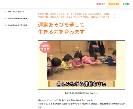 えいご・たいそう・リトミックプログラムについて、年齢別のカリキュラムやねらいなどをまとめた動画を各プログラムの紹介ページから見られるように配置しました。