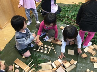 子育て支援事業最大手JPホールディングスグループでは、「五感を養って感性を豊かにします」を保育方針の一つに掲げており、グループ企業の日本保育サービスが運営する「アスク」保育園では、木製玩具を中心とした保育環境の整備や、積み木・カプラ(木製ブロック)などを用いた活動の実践など、「木育*」に取り組み五感を使った実体験を積み重ねています。