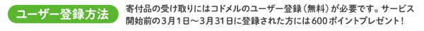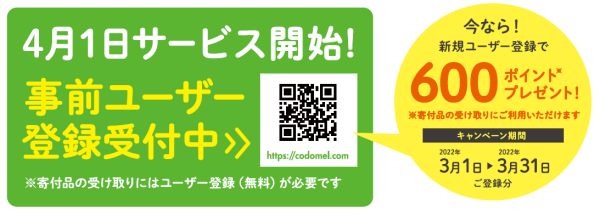 なお、期間限定でサービス開始前にユーザー登録いただいた方には、コドメルで寄付品の受け取り等に利用できるポイントを「600ポイント」進呈いたします。