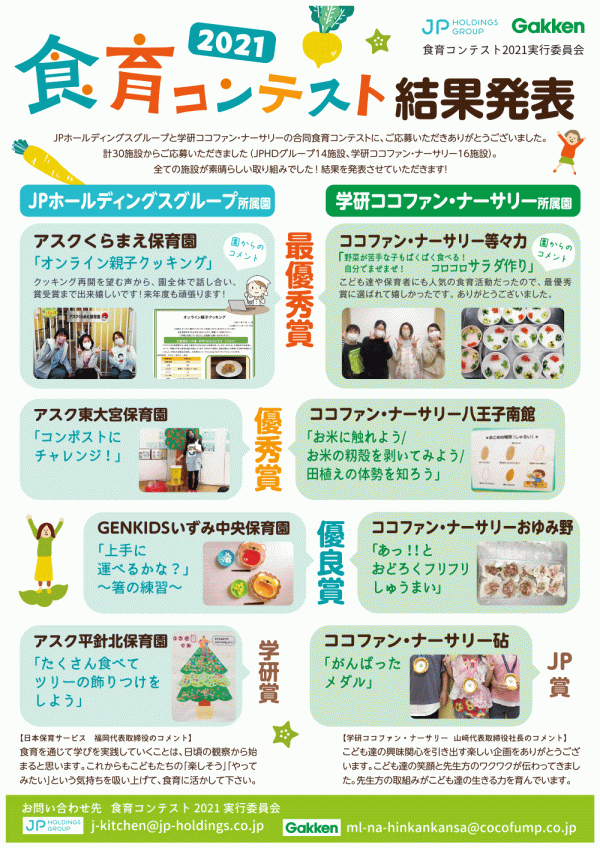 子育て支援事業最大手 JP ホールディングスのグループ企業で給食の請負事業を手掛ける株式会社ジェイキッチンは、株式会社学研ホールディングスのグループ企業である株式会社学研ココファン・ナーサリーと共同で保育園での食育活動の更なる充実を目的とした「食育コンテスト 2021」を開催し、2022年3月末に結果発表を行いました。