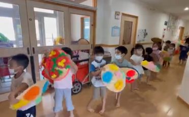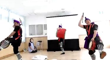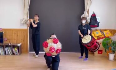 アスクみはらしの丘保育園は、先生たちの笛と太鼓の演奏に合わせ、先生と園児たちが「山形花笠まつり」の「花笠音頭」を踊りました。踊りに使う花笠の制作過程や由来も紹介しました。