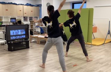 【画面越しにダンスの振り付けを教える講師たち】