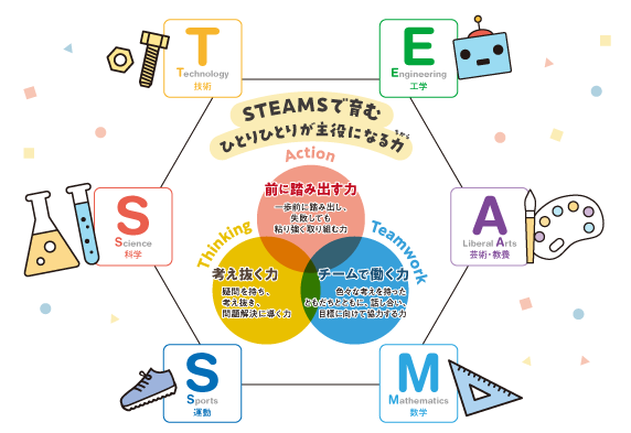 ※「STEAM教育」は科学(Science)・技術(Technology)・工学(Engineering)・芸術・教養(Liberal Arts)・数学(Mathematics)の5つの分野の頭文字を組み合わせたアメリカで開発された新しい教育方法です。すでに世界で広まり、日本でも文部科学省が、各教科等での学習を実社会での問題発見・解決に活かしていくための教科等横断的な学習として推進しています。