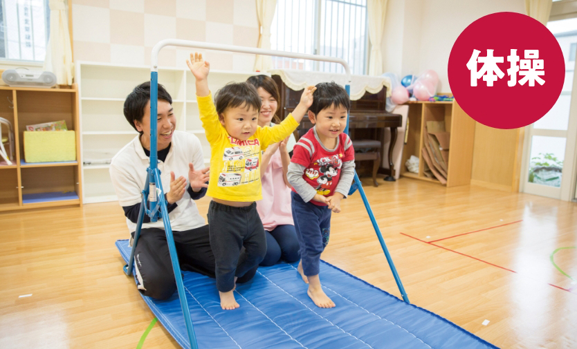 体操は、あそびを中心とした活動に重点を置いています。そのうえで、さまざまな動作を習得できるオリジナルプログラムを作成し、専任講師が細やかな指導を行います。また、からだの動きだけではなく、「たのしい」「くやしい」「またやりたい」「応援する」などのこころの動きも大切にしています。